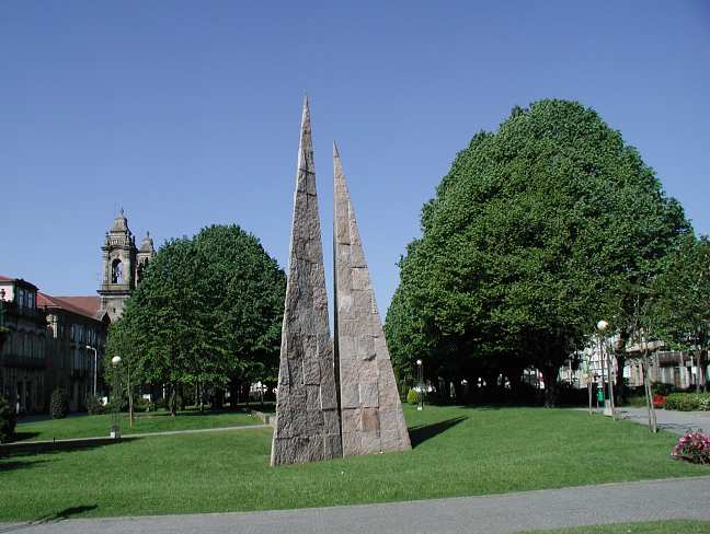 The next morning after a wonderful breakfast at the Hotel Turismo, we proceeded once again to the same places we'd visited the earlier day, to try and catch them in the morning light. Across the fountains in the main square, was this stark and very effective piece of sculpture. You can see the domes of the Igrejas Dos Congregados in the background. |