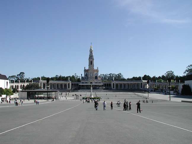 The 20th century Basilica of Fatima on a clear beautiful day, with a vast concrete pavilion stretching before it. There was a Mass underway in the church, and the air was faintly perfumed from burning candles.