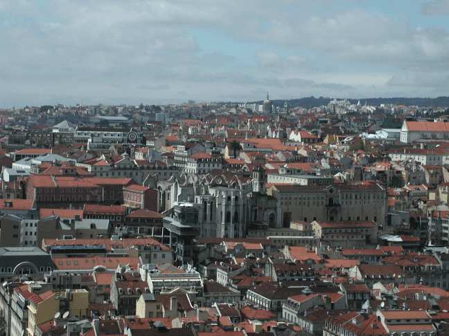 Another view of Lisboa - you can see the dark grey Santa Justa Elevador, standing in front of the lighter grey arches in the centre of the photograph. The Rio Tejo flows around the city, meeting the Altlantic beyond.