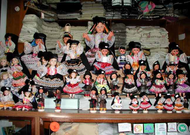 Nazaré is famous for its dolls, dressed in local costumes that are worn on different occasions. The local women still wear several petticoats and skirts (the legend puts it at seven), like the dolls displayed here. This place is also famous for its sweaters, though pure wool sweaters are hard to come by, with most being a mix of acrylic and wool |