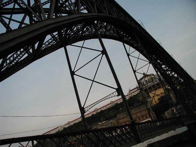 A close-up of the Ponte de Luis bridge in Oporto built by Eiffel. The lower tray connects the Oporto bank (Ribeira) to the wine cellars of Vila Nova de Gaia, whereas the upper connects the city centres of the two.