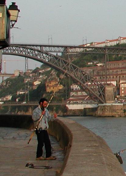 Lone fisherman fishing in the Douro river, at the Ribiera in Oporto