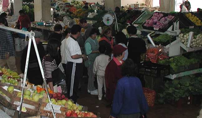 The indoor fruit and vegetable section, displaying plums, grapes, apples, pears, figs, oranges. We were a bit disappointed to find that we couldn't buy any locally grown fruit here. Most of the fruit was imported. There were grapes from Chile, oranges from Spain, and bananas from Ecuador. Not unlike a supermarket in the West. |