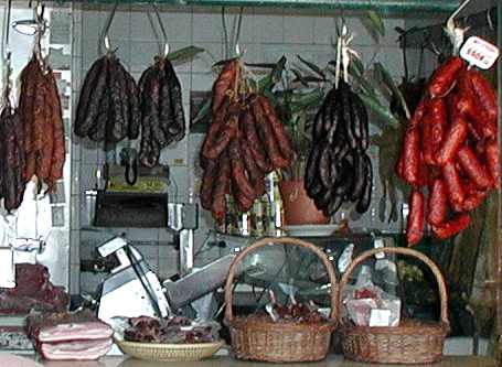 A variety of sausage - linguiça, chouriço and the famous blood sausage, which appear almost black in colour.