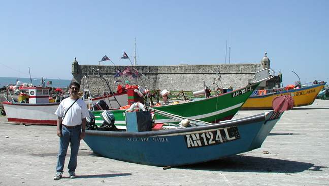 Colourful fishing boats at Vila Praia da Ancora, with part of the old fort wall in the background. The name 'Vila Praia de Âncora' when translated, means "Beach City of Anchor"